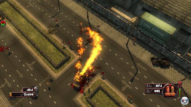Das klingt doch schon einmal nicht so schlecht – wenn man Fan von Zombiespielen oder Titeln ist, in denen unverhältnismäßig viele Zinnoberpixel ausgeschüttet werden. Die Mischung aus Micro Machines und Carmageddon geht auch tatsächlich auf. Zumindest im ersten Drittel: Man freut sich noch über neue Waffen, die neuen Fahrzeuge und auch darüber, dass man bei entsprechend hohem Tempo durch den Kontakt mit den Gegnerwellen nicht nur roten Asphalt zurücklässt, sondern die in die Dutzende gehenden Feinde mit einem netten „Flatsch“ in ihre Einzelteile zerlegt, die noch kurz in der Umgebung umherkullern, bevor sie sich in Wohlgefallen auflösen.
