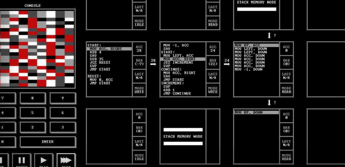 Minimalismus im Extrem: Auf einer schwarz/weißen Oberfläche erlebt man kein Abenteuer, löst keine Rätsel. Man programmiert die Lösung komplexer Aufgaben. Statt einer Erfolgsmeldung folgt eine Statistik über den Rechenaufwand des fertig geschriebenen Programms. TIS-100 fordert die grauen Zellen. TIS-100 ist Arbeit. Wo steckt da der Spaß?